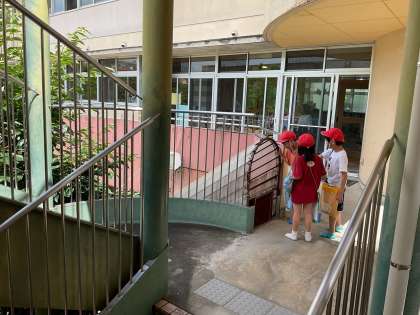 総合的な学習で、朱八校区のすてきを探すために、学校の隣にある洛陽幼稚園の中を見学させていただきました。
