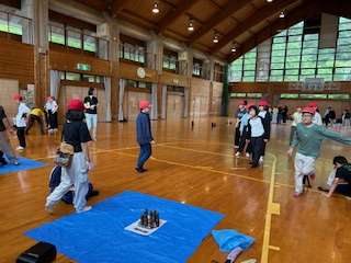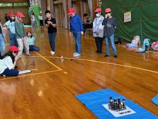 木の棒を投げ、50点ジャストでゴールを目指します。