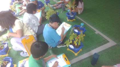 つぼみや花が咲いていて、花びらがどうなっているのかよく見てみたり、大きさを確かめたり、興味津々の子どもたちでした。