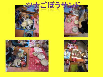 11月28日の給食は「コッペパン、牛乳、ツナごぼうサンド、チャウダー」です。ごぼうはきんぴらごぼうや筑前煮など和風の献立に使うことが多いですが、今日はサンドイッチの具にしました。カレーマヨネーズ味の具を1年生も上手にパンにはさんで食べていました。「カレー味がよく効いていて美味しかったです。」「コッペパンと具がよく合っていました。」「ツナとごぼうの組み合わせがよかったです。」・・・子ども達の感想より