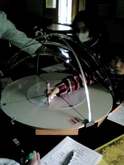 太陽の高度が季節によって変わることから、影曲線が変わってきます。夏至・冬至・春分・秋分の太陽の高さにライトを合わせ、実験しました。南半球のオーストラリアでは、太陽の動きが日本とは違う不思議を感じ取っていました。