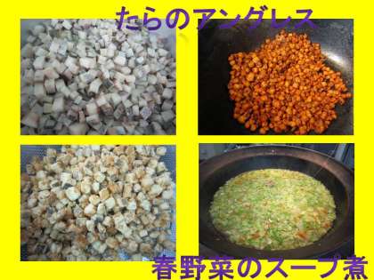 4月22日の給食は「ごはん、たらのアングレス、春野菜のスープ煮」です。たらは料理酒で下味をつけてから油で揚げてトマトソースで絡めてアングレスにしました。スープ煮は春野菜の新たまねぎや春キャベツ、新じゃが、にんじんなどの具で作り、月桂樹の葉で香りをつけながらコトコトと煮込んで仕上げました。1年生も当番が上手に出来るようになりました。「スープ煮は野菜がたっぷりで美味しかったです。」「スープ煮のじゃが芋がホクホクしていました。」「たらのアングレスが甘くて美味しかったです。」「たらのアングレスが美味しかったので、おかわりをしました。」・・・子どもたちの感想より