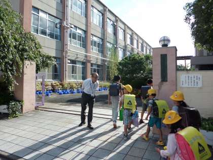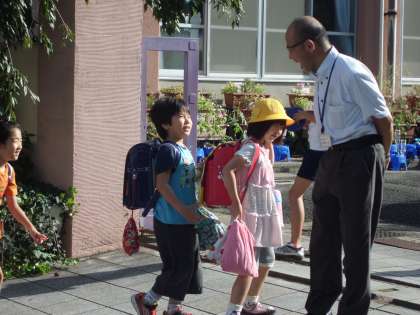 9月12日からイングリッシュ・シャワーの取り組みとして,『英語の日』がスタートしました。毎週金曜日,子どもたちは,朝、校門で校長先生と英語で