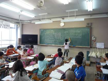 5時間目の算数の時間に「わり算を使って考えよう」という学習をしました。「30このいちごを1皿に5こずつのせました。お皿はみんなでなんまいありますか」問題を読んで,図を見て考えました。まず,1人で考え,ノートに書きます。それから,グループで話し合ったり全体で話し合ったりします。考え方を説明したり,式を発表したりしました。