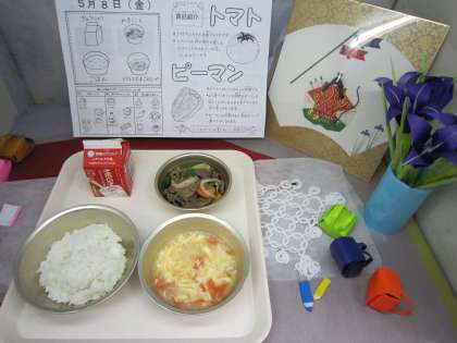 5月8日の給食は「ごはん、牛乳、焼肉、トマトと卵のスープ」です。「焼肉」は夏に向かって給食に登場する献立です。家の焼肉と言えば肉がほとんどで、野菜は少しでは無いでしょうか?給食の焼肉は肉の約1.5の野菜が入っています。苦手なピーマンも入っています。また、「トマトと卵のスープ」もこれからの季節の定番献立です。真っ赤なトマトは生で食べることが多いですが、給食ではスープに入れたり、スパゲティに入れたりと熱を加えています。真っ赤なトマトと黄色の卵のスープはトマトが苦手な子ども達も意外と食べていました。1年生の感想に「ピーマンは苦手だけれど肉と一緒に食べられた。ごはんも焼肉と一緒にたくさん食べられた。」「トマトは苦手だけれど、スープのトマトは食べられてうれしかった。」他の学年も「焼肉がバーベキューをした時みたいですごく美味しかった。」「焼肉の味の濃さがちょうど良かった。」「肉に味がものすごく絡み合って美味しかった。」などたくさんの感想がありました。