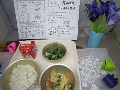 5月14日の給食は「麦ごはん、牛乳、厚揚げのごまみそそぼろ、かまぼこと小松菜の炒め物」です。「厚揚げのごまみそそぼろ」は新献立です。鶏ひき肉をそぼろになるまでよく炒めて、先にだし汁で煮含めた厚揚げを加えて、みそや練りゴマ・すりごまなどで味つけしました。じゃが芋やにんじん、三度豆も加えてボリュームたっぷりのおかずです。「そぼろと厚揚げが合っていて食べやすかったです。」「ごまの風味が香っていました。」「厚揚げにだしがしみていて美味しかったです。」「ごまみそがとろとろしていて美味しかったです。」・・・子ども達の感想より