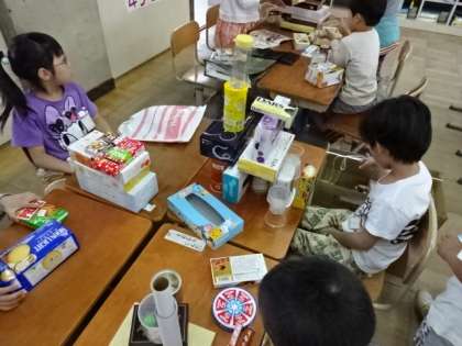 恐竜や電車,お城や飛行機など,子どもたちは発想を膨らませて作っていました。