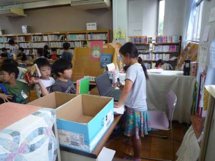 図書館では,図書委員会の子どもたちが図書館を利用する子どもたちを待っています。返却の手続きが終わると本は箱に入れます。