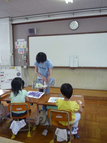 絵具をポトポトとたらして絵具遊びをしながら画用紙に色づけをしました。