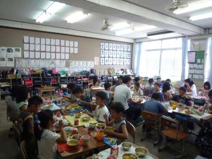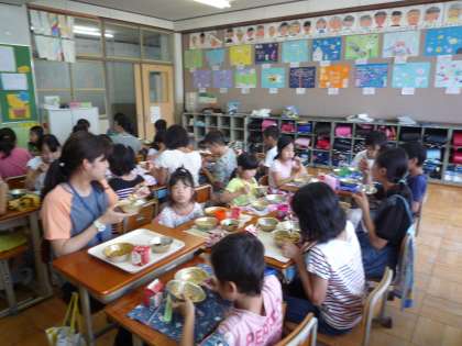 たてわりグループで給食をいただきました。4年生が1年生を迎えに行き,5・6年生が準備をしてくれます。今日のメニューはカレーとひじきです。いつもは遊んでいるグループの人たちと一緒に食べるとおいしいです。