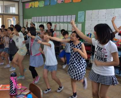 教室には,笑顔がいっぱい。大きな歌声が響き,英語のリズムにのって楽しいパフォーマンスが繰り広げられました。楽しいダンスを教えてもらいたいですね。