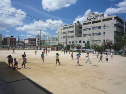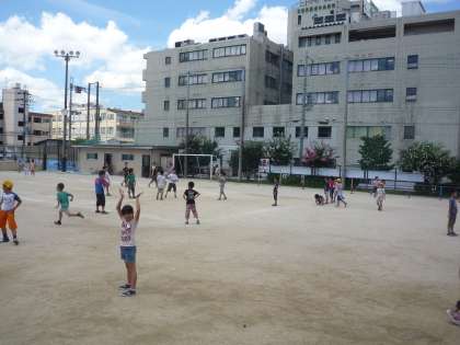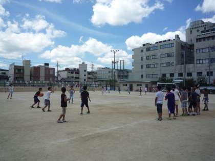 運動場を見てみると,とても暑い中ですが,3年生がハンドベースをして遊んでいます。4年生はみさきの家が延期となり,少し残念ですが,ドッジボールをして遊んでいます。5年生は男女一緒にハンドベースで遊んでいます。