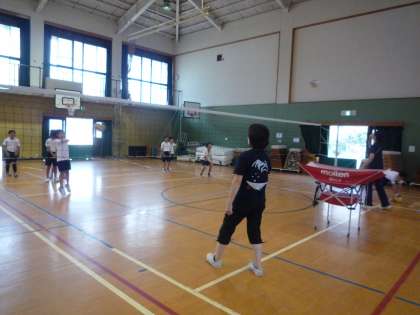 午後からはバレー部が練習をしました。一列に並び,レシーブの練習です。4年生はネットをはさんで先生にかえす練習です。5・6年は長椅子もつかってレシーブの練習をしました。