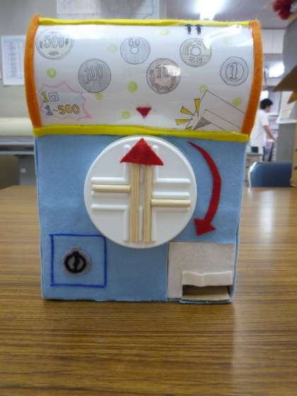この貯金箱は,お金を上から入れ,出したい時に回すと下から出てくるようになっています。中でうまくお金が落ちるように長さをはかったり調整するのが大変でした。