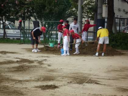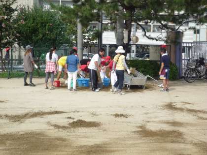 たくさんの子ども達も手伝ってくれました。小さなスコップで土を入れてくれたり,土をまいてくれたりしました。