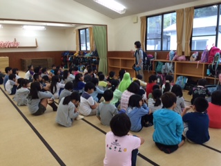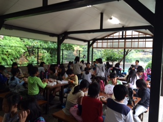 野外炊事場でお弁当をいただき,その後90畳の大広間に大きな荷物を置きました。
