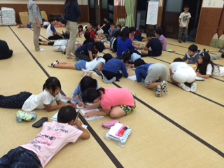 楽しいキャンプファイヤーが終わり,90畳の大広間に戻って1日目の振り返りをしました。