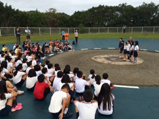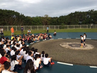 一緒に宿泊している学校のお友達と,朝のつどいに参加しました。みさきの家の所員の方のお話を聞いたり学校紹介をしたりしました。