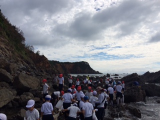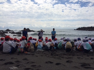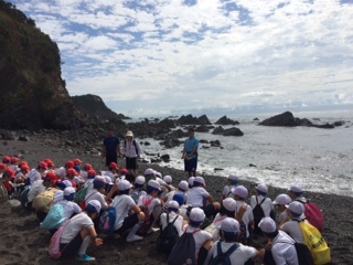磯観察が始まりました。鳥羽水族館の方が,磯の生き物のことを教えてくださいます。