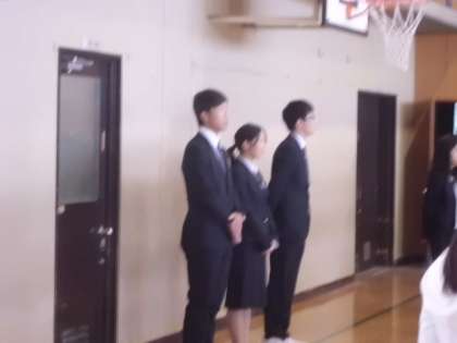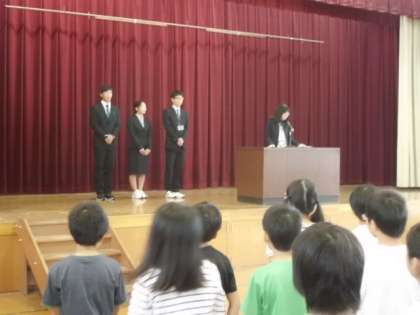 その後,今週から来られる教育実習生3名の紹介がありました。実習生のうち2人は,朱八校の卒業生で,もう1人も,ずっとボランティアに来ていただいている学生さんなので,3名とも始業式で校歌をしっかり歌っておられました。