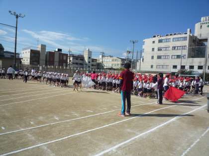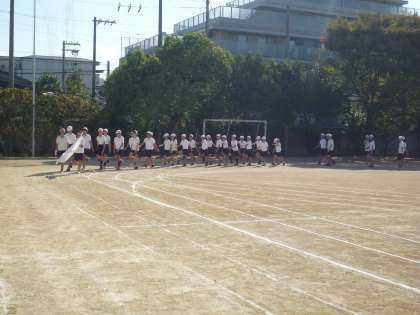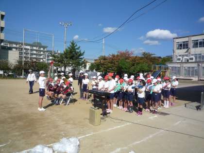 今度の日曜日の運動会に向けて全校練習を行いました。まず,音楽隊の演奏に合わせて入場を行いました。