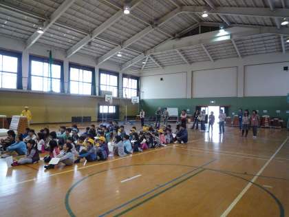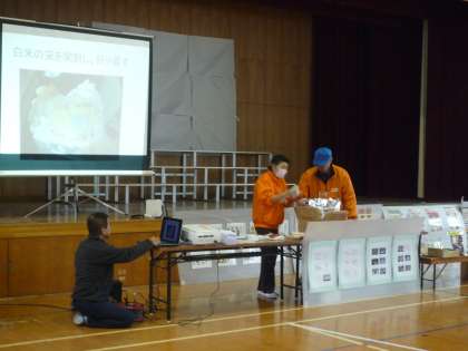 自主防災会の方々から備蓄米であるアルファ化米についてのお話がありました。水を入れるだけでお米が炊けることや箱の中に手袋やおしゃもじなども入っていて,災害の時に利用できるように工夫されているとのことでした。