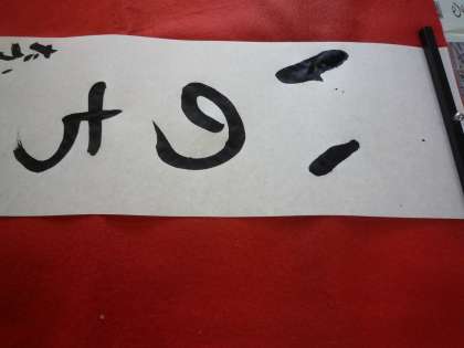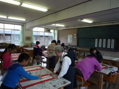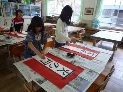 ここは,「防災標語を書こう」のコーナーです。「火の用心」「いのち」「けす」「まもる」などの言葉を丁寧に書きました。1・2年生は,「初めて習字を書く」と言っている子どもがたくさんいましたが,みんな熱心に書いていました。