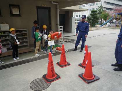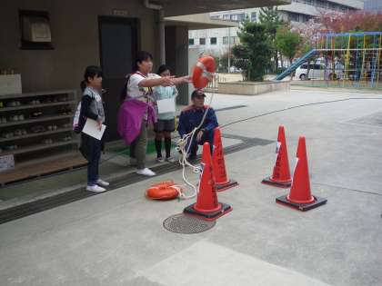 ここでは,水難の時に使う浮環を投げる練習をしました。このコーンに入ったら5点,ここは10点。2回投げられます。さあ何点?