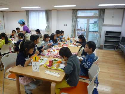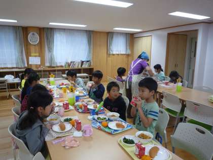 ランチルームを楽しみにしている子どもが多いです。今日もおいしくいただいています。