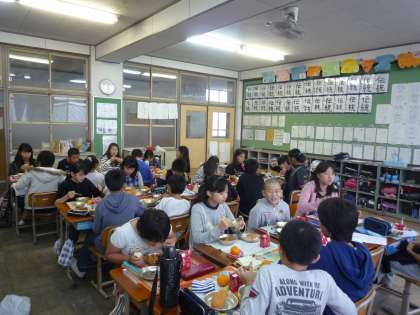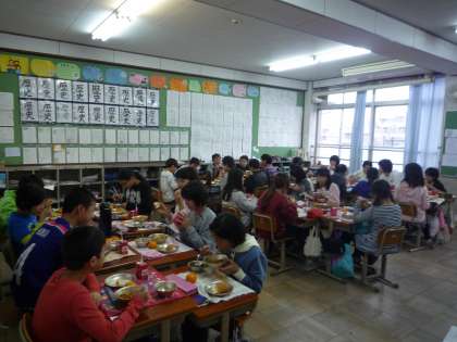 教室の近くまで行くと,賑やかな声が聞こえてきました。6年生は楽しく話しながら給食を食べていました。