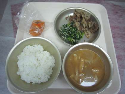 11月27日の給食は「ごはん、牛肉とれんこんの煮つけ、だいこん葉とじゃこのいためもの、秋の恵のみそ汁、柿」です。今日は11月の和献立です。秋に美味しい食材を使って作りました。れんこんは牛肉と甘辛い味つけで煮つけました。またみそ汁は大根、しめじ、さつま芋を具にしました。みそも京北地域で作られたものです。「みそ汁のお芋が甘くてほろほろしていました。」「れんこんがシャキシャキしていてとても美味しかったです。」「牛肉とれんこんの煮つけの味がしっかりしていたので、ごはんとよく合いました。」「れんこんの歯ごたえが良かったです。柿も美味しかったです。」・・・子ども達の感想より。
