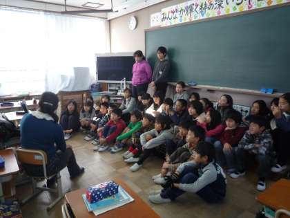 5年生は少し人数が多いので,座ったり立ったりしながら,おならの話を聞いていました。笑い声も聞こえてきました。