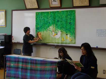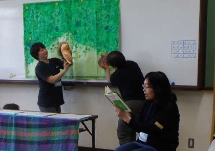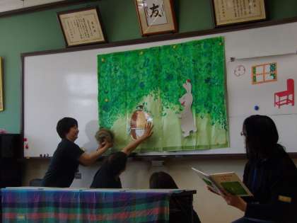 1年生は今日がはじめてのじゃんけんほんです。今日はたっぷり45分あるので,お話の読み聞かせだけではなく,お話に合わせて,こんな風に動物もできます。