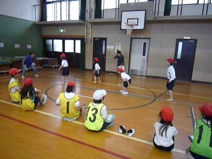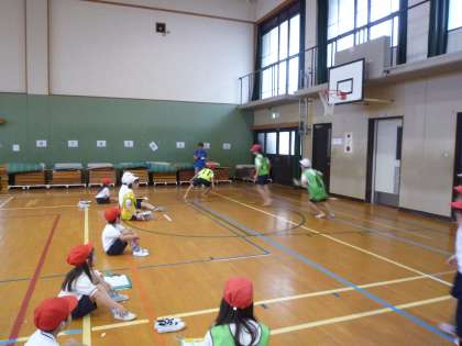 反復横とびのコーナーです。1年生が何回できるかを「がんばれー」と応援しながら6年生が数えています。