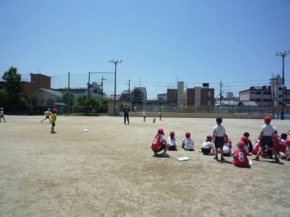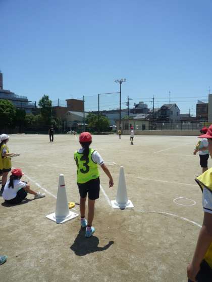 ソフトボール投げです。昨日は天気が悪かったので体育館の種目をしましたが,今日は外の種目もできました。