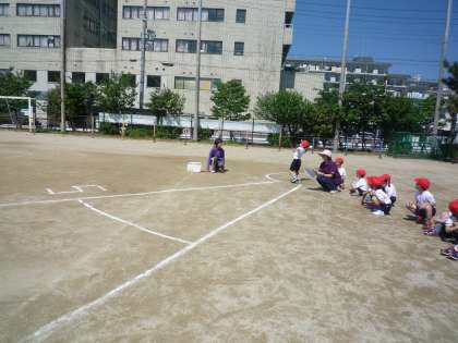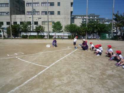 運動場で1年生がソフトボール投げをしています。ソフトボールをしっかりと握り,遠くまで投げています。