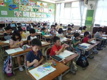 2年生が引き算の学習をしています。17−9の求め方を考えています。数え棒で操作したり,ノートに絵やことばで考え方を書いたりしています。