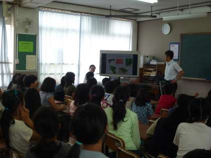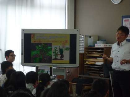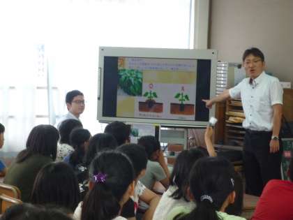 まず,「ピーマンが嫌いな人」と尋ねられ,手を挙げた子どもが7人でした。私たちは,ピーマンを育てることで,ピーマンが好きになったり,食べられるようになってくれればという思いがありました。その少なさに少しびっくりしました。その後,野菜の花や葉っぱ等のクイズがあり,子ども達は楽しく勉強していました。