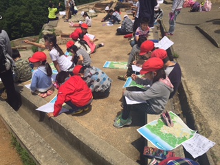 社会科の学習で使う「絵地図」も見ながら,見つけた施設や川などを遠足のしおりに書き込んでいます。