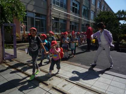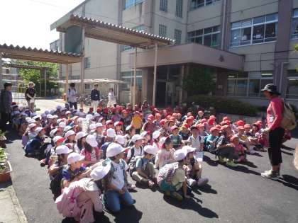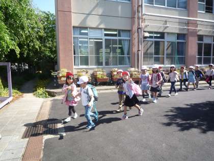 出発前に約束の確認をし,爽やかな五月晴れのもと元気に出発しました。