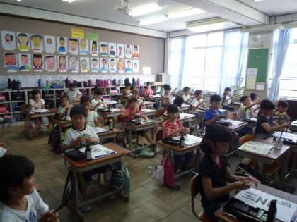 今日が初めての習字の学習です。習字セットはここに置いて,姿勢を正して,筆は・・と学習が進みます。