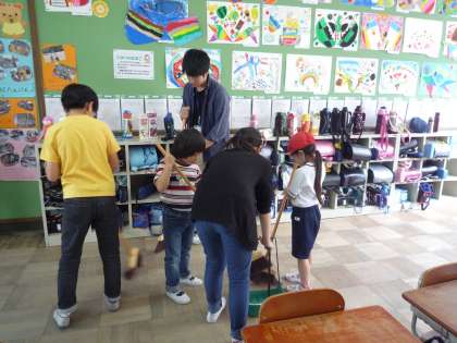 教室掃除のグループもあります。高学年も低学年も頑張ってきれいにしています。