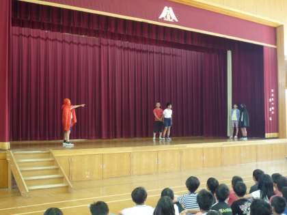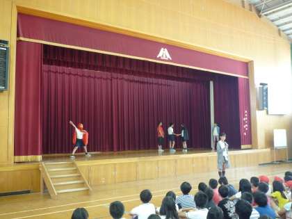 昨日児童朝会がありました。児童会では今月のめあてを考え,わかりやすい劇で全校児童に伝えてくれました。