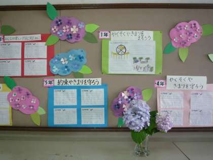 それぞれの学年でどんなことを考えたのかな。どんなことを学習したのかな。この職員室前にある掲示板で学習したことを交流しています。
