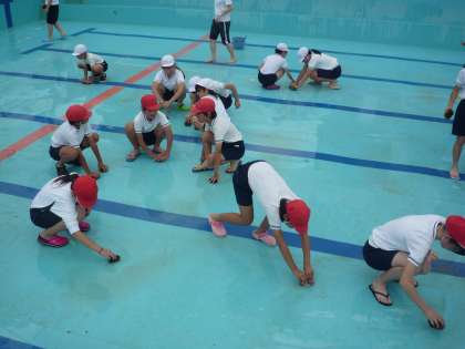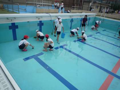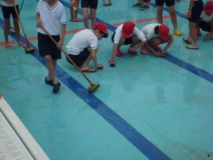 プールの床も結構汚れています。ブラシやたわしでこするととてもきれいになります。6年生が一生懸命きれいにしてくれました。