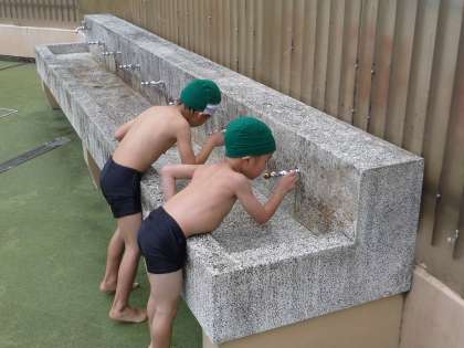 朝方の雨もあがり,今日は1年生とひまわり学級がプールに入り,水慣れを行いました。1年生は小学校ではじめてプールを使用するということもあり,プールを使うときのルールについてしっかりと学習しました。