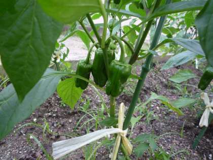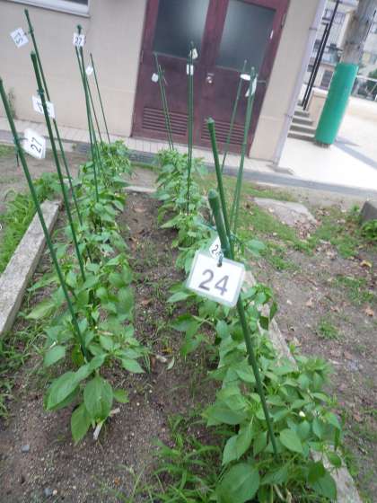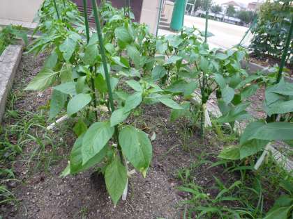 5年生が育てているピーマンです。随分大きくなってきました。ピーマンが3つできています。