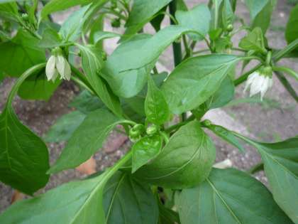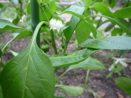 ピーマンのお花です。白いかわいらしい花が咲いています。