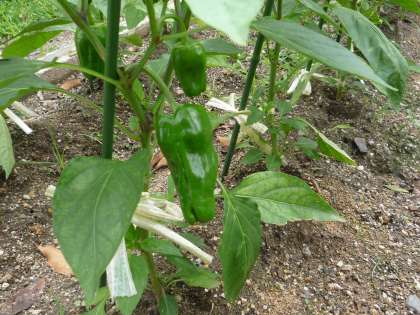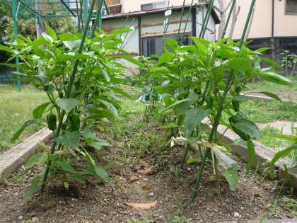 5年生が大切に育てているピーマンが成長しています。大きいものでは7cmほどまで育ってきました。みんなが毎日水やりや草ぬきをしているおかげを感じます。