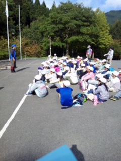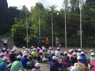 山登りに出発します。初めに山の家の先生から山登りの約束や注意することについてお話を聞きました。